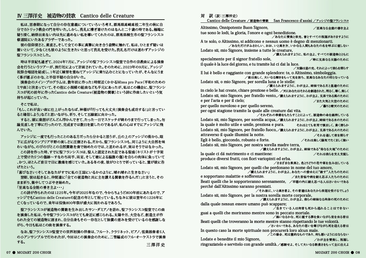 今日の9月7日日曜日(*1)は、世界中のカトリック教会で「被造物を大切にする世界祈願日」となっている。まさに、その日にこの「被造物の賛歌」を演奏出来るなんて、なんて自分は恵まれているのだろうと、すでに感動を胸に抱きながら、心を込めてこの曲のタクトを降ろした。