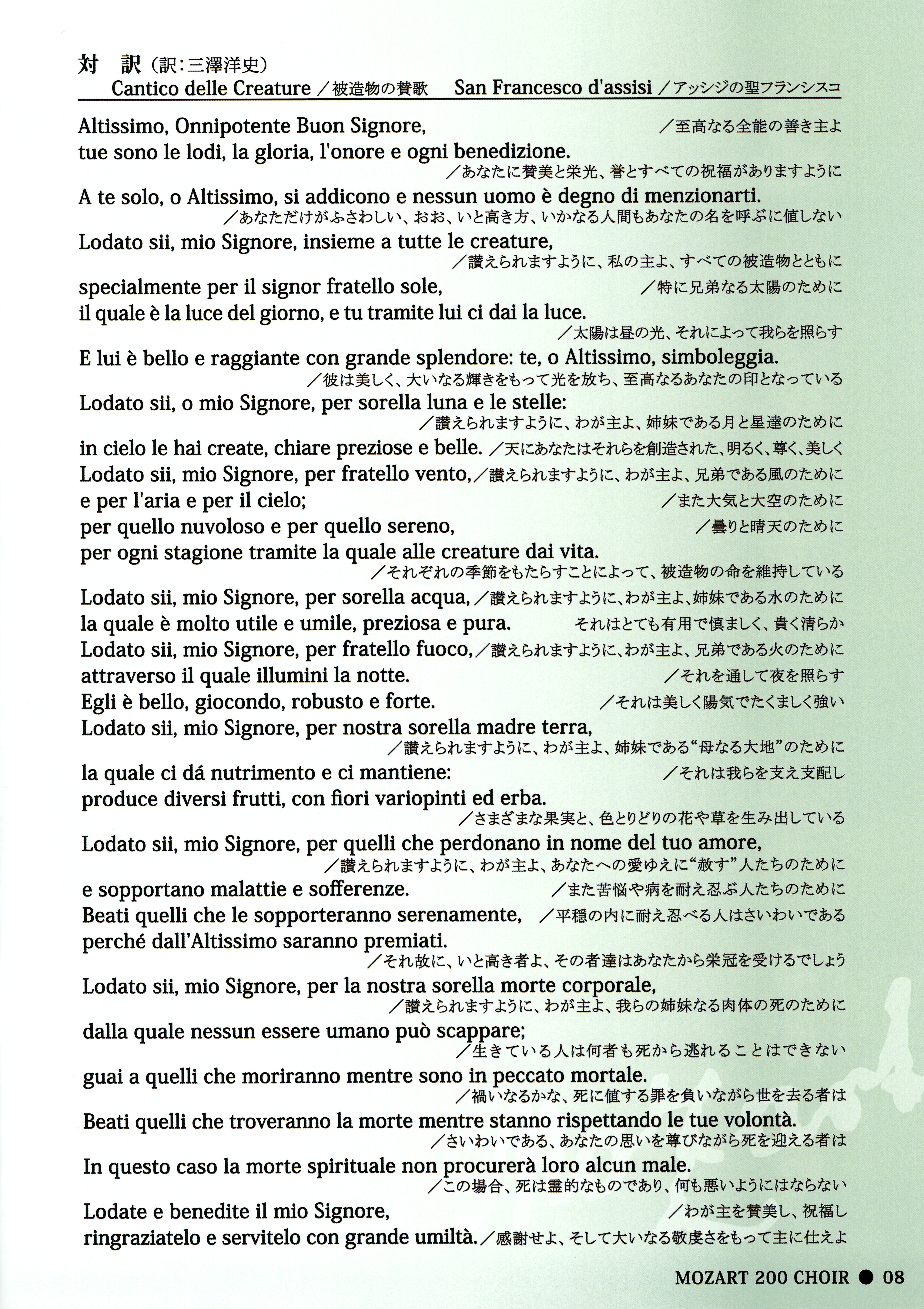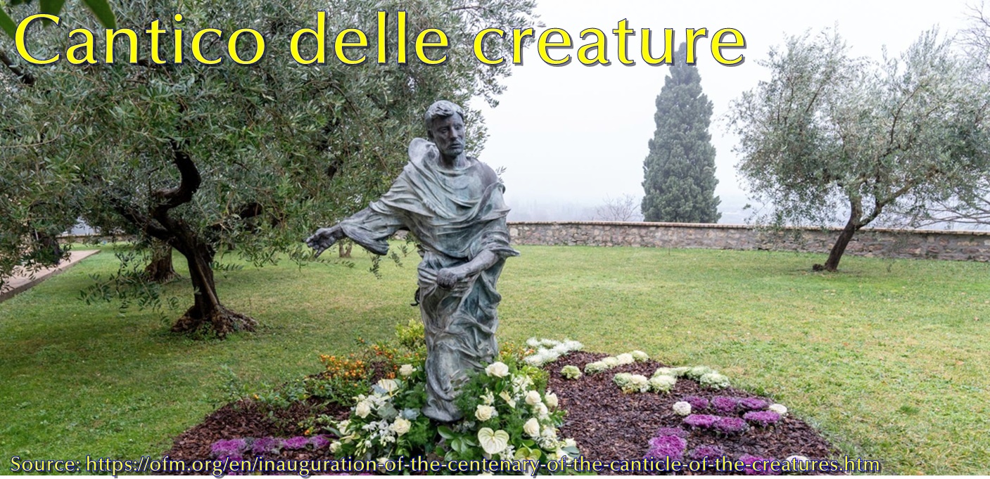 聖フランシスコが、太陽や月や星から始まって、全能の神が創りたもうた、ひとつひとつの創造物を丁寧に讃え、その後半では、病や、そして死までも讃え、初めて「禍いなるかな」という言葉を出して、「死に値する罪を負いながら」の死を慎むように諭し、その反対に創造主の想いにリスペクトしながらの死を讃えるという、壮大な詩!
