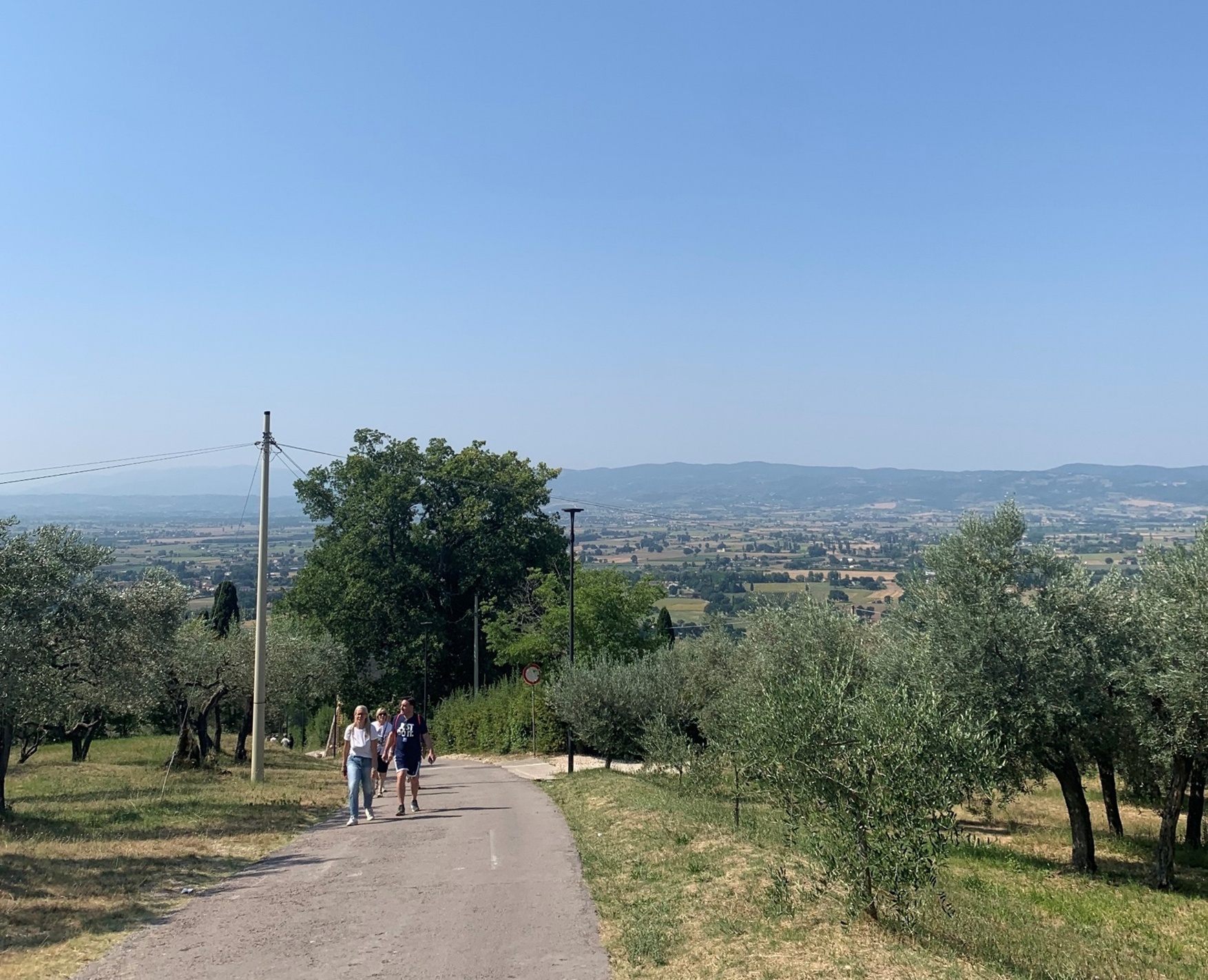 本番のある20日の昼、僕は妻と二人で、まず聖キアーラ教会に行き、それから聖フランシスコが初めてイエスの声を聞いた貴重な教会、サン・ダミアノ教会を目指す。市門を出て、オリーブ林に囲まれた下り坂の小道を妻と二人で散歩する・・・というと、のどかな感じがするが、実はとても暑い。勿論日本のようには湿気がないのでマシだけれど、照りつける日差しの強さは日本よりずっと強い。坂をずっと下っていくと、懐かしい教会が見えてきた。