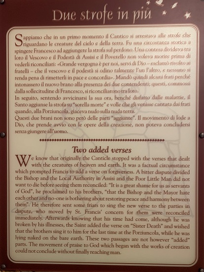 元の「被造物の賛歌」では、天と地にある被造物に関連する詩句で終わっていました。しかしながら、ある事情がフランシスコに「赦しに関する詩句」を追加させることになりました。